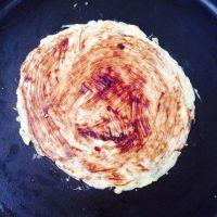 面糊定型后翻面加蛋液,蛋液定型后在翻面抹上甜酱。